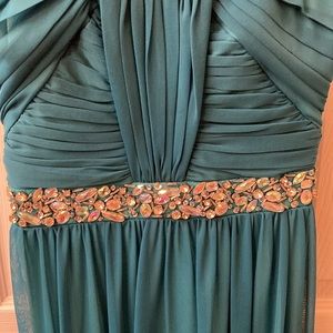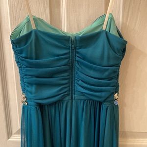 In perfect condition and used once. Strapless prom dress. No stains or rips. Chiffon overlay. Very pretty green color.
