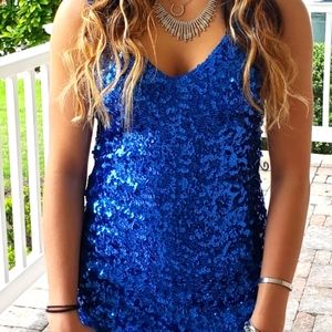 This is a stunning form fitting custom altered prom or party dress. Size small. No tags. Deep blue sequined and full lined.