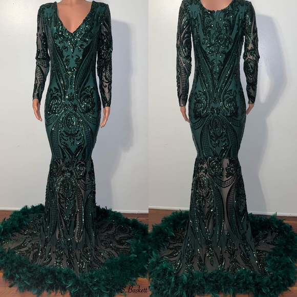 Hello, this dress was made for my daughter's Prom last year. It was tailor-made to fit her, so if measurements are needed, please let me know. It was worn for a couple of hours for her Prom, and I must warn you that some of the feathers at the bottom may be missing. It's a beautiful dress and my daughter was gorgeous in it. Thank you