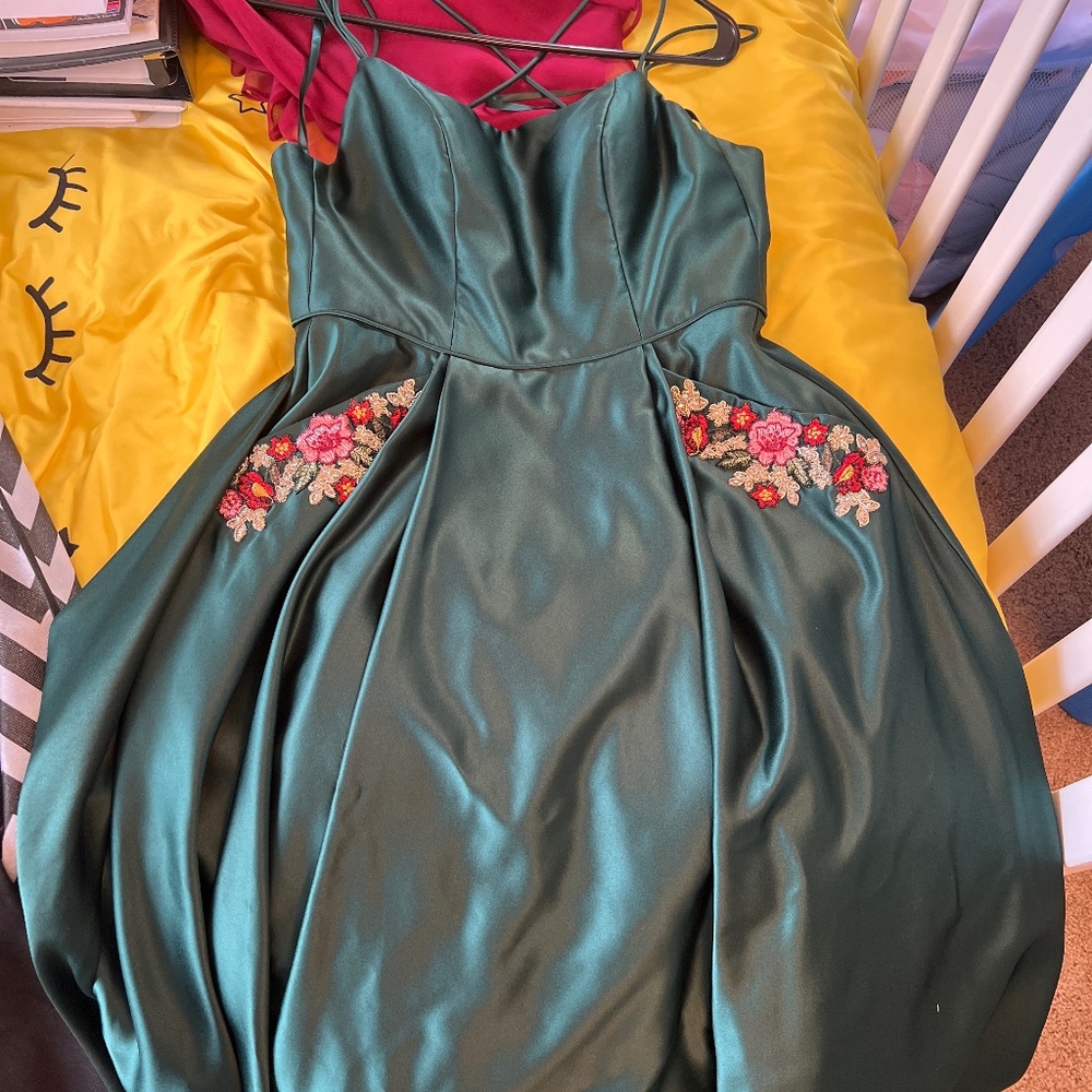 Dark Green, embroidery on the pockets. (IT HAS POCKETS!) Longer dress, cross straps in the back for design.
