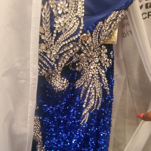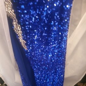 Beautiful long blue sequins gown with rhinestones at the top and a split. This was my daughter prom dress. The dress is absolutely beautiful in person.