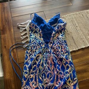 Ellie Wilde short prom dress. Beautiful! size 2 Has been altered to fit smaller but everything can be let out Beautiful electric blue dress with gold iridescent sequins corset back straps My daughter is 5'6