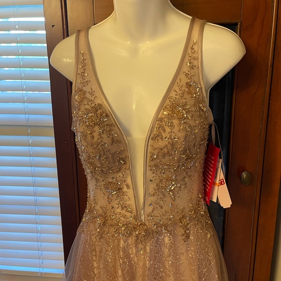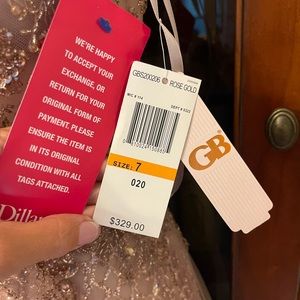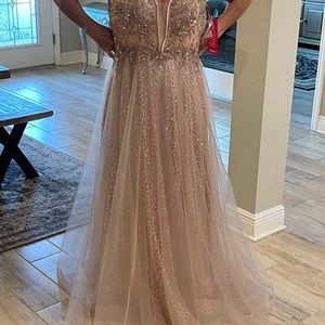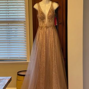 Beautiful prom dress never worn but during Covid excellent condition beautiful almost rose gold color, color. Bought from Dillards.