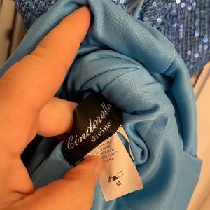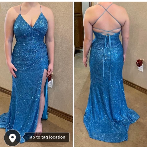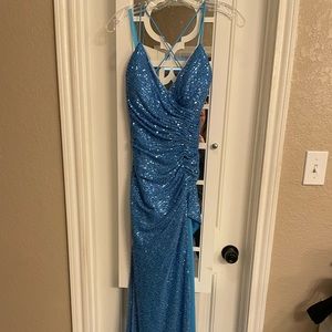 Never been worn. Tried on,bought, decided on different dress. Size 8 form fitting, blue sequin prom dress.