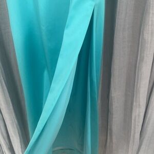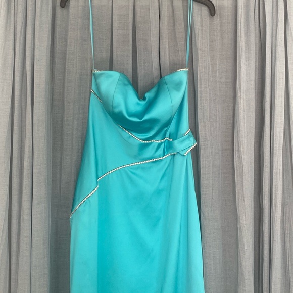 Aqua strapless long dress. Side zipper. There is a side slit as well on the left side of the dress. Beautiful rhinestone detailing around the bodice front and back. There is a front piece that adds an asymmetrical detail. This piece snaps closed and is also outlined with rhinestones.
