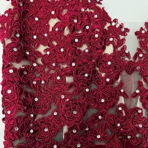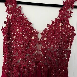 Rhinestone embellishment, built in bra, boning, no leg slit, v-back, back zipper, A-line. Worn once