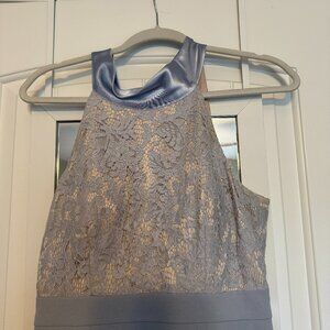 Baby blue prom dress, worn to prom once. There is some grass staining at the bottom in the back, one mark on the front that should come out with stain remover. Very comfortable. Has built-in pads up top. I wore it with 4" heels and I am 5'5.5".