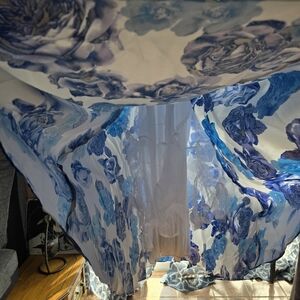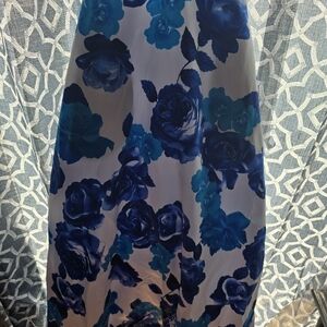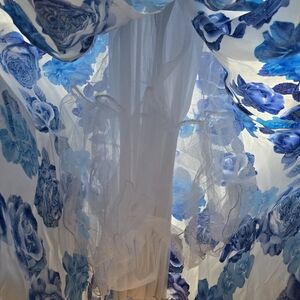 A long white and blue printed roses with spaghetti straps along with straps on the back to tighten back support given a lovely back view. The skirt has a hoop skirt with a polyester skirt underneath for comfort and it has side pockets.