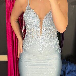 Worn once, in perfect condition. Has been altered to make train shorter. Style #88626 AMARRA (gipperprom.com) color light blue, size 0. Shimmer jersey gown with lace embellishment corset top and deep V illusion neckline.