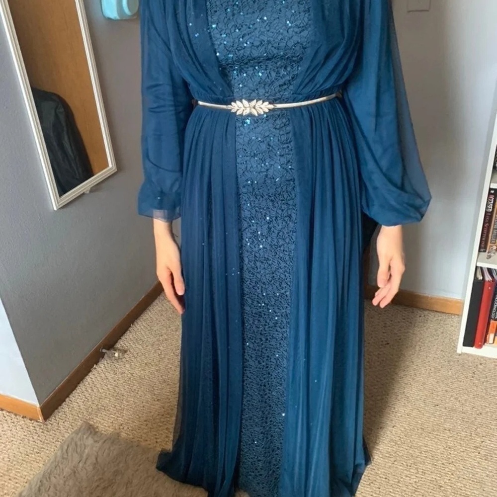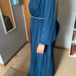 Formal modest gown- only worn once. Dress is a one piece gown w/ a belt (blue matching belt) -head piece is not included- -silver belt not included