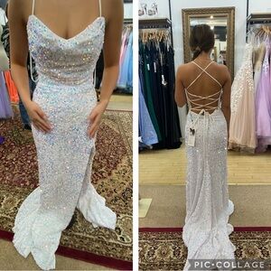 This elegant white dress is perfect for any special occasion. Its sleek design and subtle sparkle make it a standout piece for any prom or pageant event.