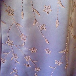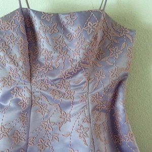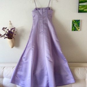 Gorgeous sparkling purple dress with spaghetti straps! It has an empire waist which measures approx. 14.5" from side to side. Underarm to underarm measures approx. 16.5". Length from shoulder strap to hem is approx. 54”. Worn only once. In excellent condition. It goes well with the shrug shown in last pic (not included; listed in a separate post). You could even have the dress tailored shorter as wedding guest dress. It's a beautiful dress, can't go wrong with it!