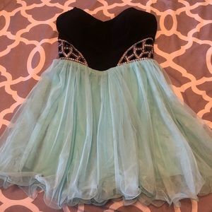 Blonde Nites by Stacy Sklar strapless prom dress homecoming dress. Size 5. The top is Black with cut outs on sides with beautiful iridescent detail work. Bottom is a mint green with 4 layers.