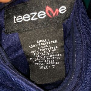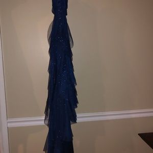 Beautiful prom dress that has only been worn ONE time. Color is an elegant navy blue with sparkles throughout the dress. This is a strapless dress. The dress is shorter in the front and longer in the back. Size 7 and fits true to size.