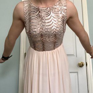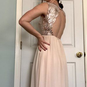 Flowy floor-length prom or formalwear dress. Blush chiffon bottom with scalloped sequined top. Obsessed with the split open back! Only worn once & in excellent condition. Size small.