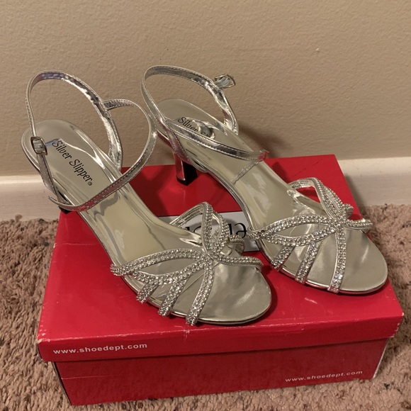 Worn once about 4 years ago, they have been sitting in the box since then. Silver 2.5 inch heels with replacement heel tips in the box.