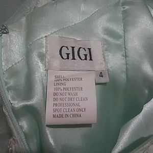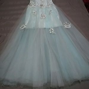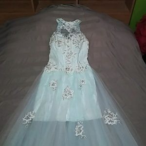 Worn once at Prom. My daughter is 5'4, wearing flat Converse shoes, 115 lbs, 34B cup, no bra needed. No alterations were done to this gown.