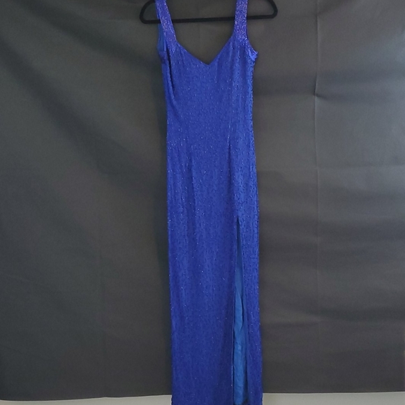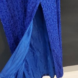 Beautiful royal blue long evening gown used for pageant and homecoming. Hand sewn beads throughout the entire dress. Sweetheart cut front with thick straps for support which are also fully beaded. Fully lined inside, zipper back with eye hook closure and built in cups. This dress has a high slit in front and is a size small or size 4. Some thread fraying but not noticeable. Great for any evening event, needs slight cleaning by hand only.