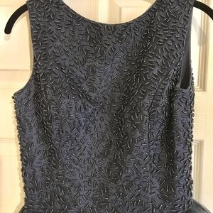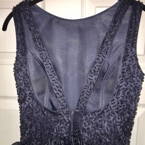 Dark navy gown, size 2, with a beaded tank-style top, low cut back, and multi organza folds over the polyester base (creates beautiful fullness). Altered for height (5’ 3.5”), and only worn once.