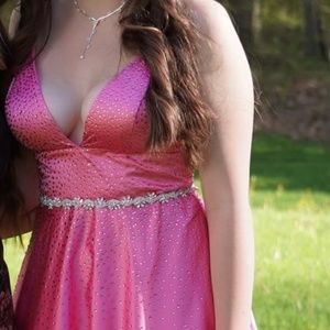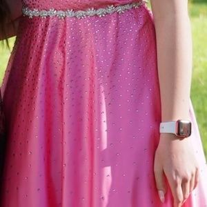 Prom Pink / Hot Pink / Barbie pink full skirted prom gown with rhinestone crystals. A-line V-neck. Lace up back with adjustable straps. Post-purchase we added the crystal belt at additional cost. Lovely sparkles in the light. Laced-up bodice provided good support to my big-busted prom-goer. Worn only once and the dress was memorable enough that she isn't going to wear it again and wants to pass on the fun vibe this prom season. It has been dry-cleaned. From former tag: CLASS/STYLE 24061510 / Stretch Satin Ballgown w/heat set stone. Originally $329.95 from David's Bridal.