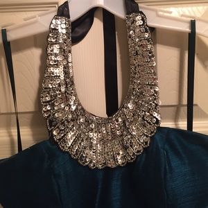 Short and more of a green than blue but a great color. The sequin necklace is part of the dress. Only worn once.