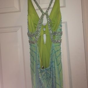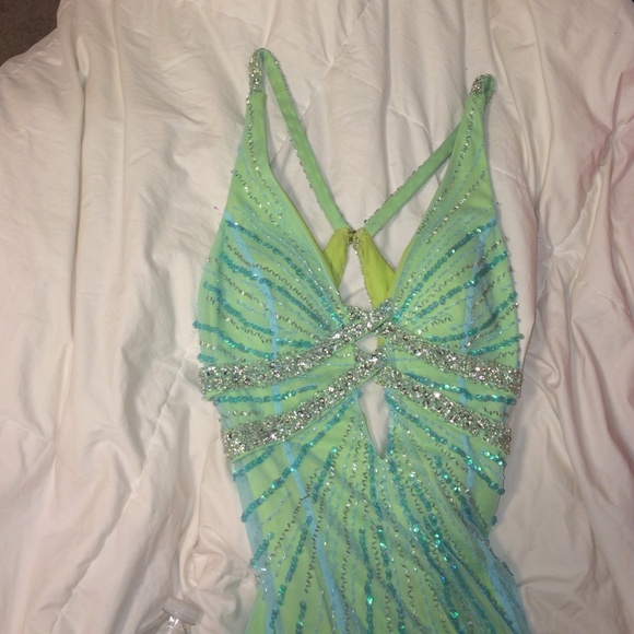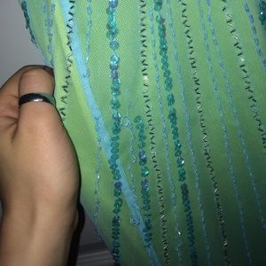 Green and blue mermaid dress!! A couple of the jewels have fallen off!! But not noticeable! Only worn once!! This would fit a size C or D bra size! It only says size medium and I'm not sure what number that is so I put down a size 8 or 10