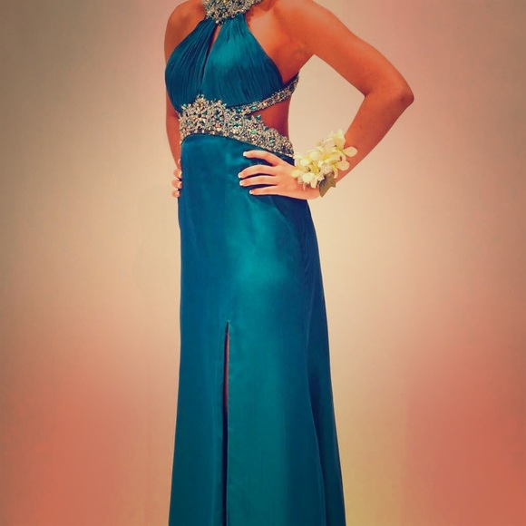 The dress is teal and has an open back. The beading comes up high on the neck. It was originally a size 8 but was taken in to about a size 4. I am 5'7" and weigh about 135 lbs. Dress was only worn once.