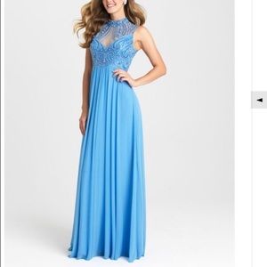 It's a baby blue Beautiful prom dress. It has no missing beads. I had it dry cleaned after I wore it for prom. Offer for lower prices. I can go lower