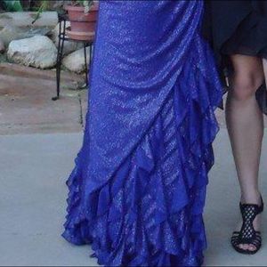 Blue/purple sparkly strapless prom dress with padding so you don't have to wear a bra. It is in great condition only worn once for prom. It was bought from Dillard's and it came with a plastic bag thing to protect it.