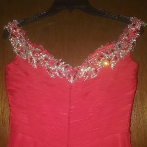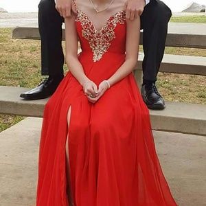 Red dress with a slit down side, 2 straps. Rhinestones are on see through fabric in front.