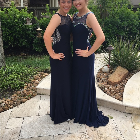 Navy Camille La Vie, size 4 dress. Worn once, in great condition. Mesh back and sleeves with iridescent jewels. Slight train, form fitting. I am 5'4 (pictured with heels at 5'8) 120 pounds.