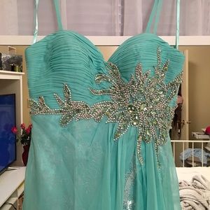 Size 1/2. I'm 5'2. Long train, no alterations made. Side slit on right side. Worn once, needs dry cleaning.