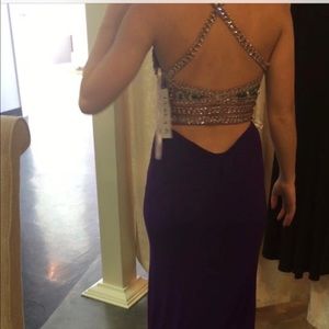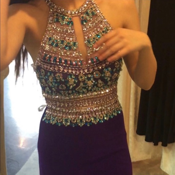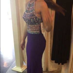 Long beautiful purple prom dress with multicolored rhinestones down to the top of the hips. Open back. Paid over $500 originally and added a slit in the left leg. Perfect condition! And very flattering to the backside!! *Available after April 29th