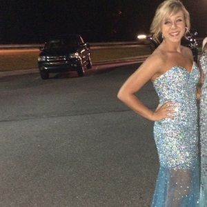 Gorgeous all beaded prom dress with sheer bottom also beaded no missing jewels! I hate to let this dress go but hope someone enjoys it as much as I did! Only wore once for a few hours!