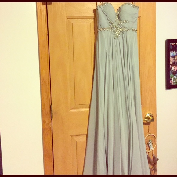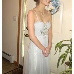 Dusty blue flowy prom dress. Had it hemmed slightly but still long. Also added straps but could be easily removed