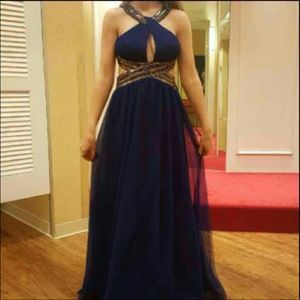 Navy with gold details. Open back as shown in pictures. VERy elegant!