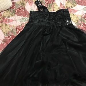 It is a black prom dress with one sleeve. On the sleeve are flowers made out of sequins. The dress stop just above the knee. Worn once.