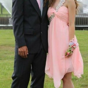 Light pink mid length prom dress. Still looks brand new. Has gem one shoulder that crosses the chest. Slight opening in upper back