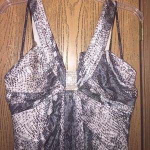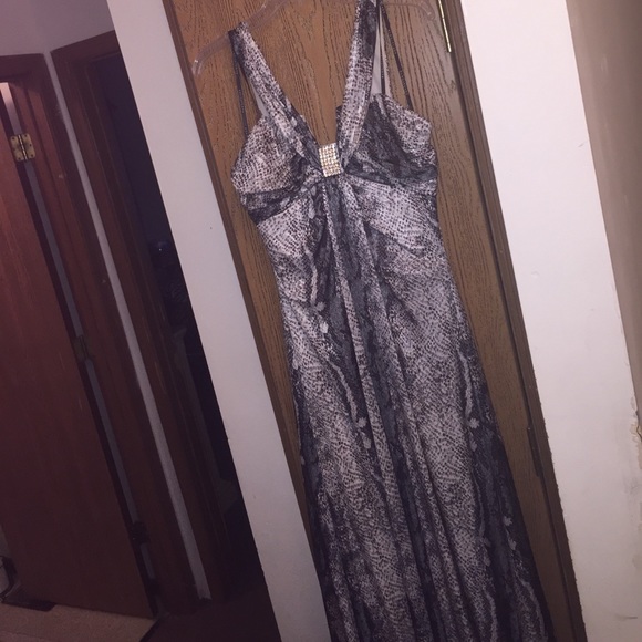 I am selling my old prom dress only worn once it is 100% polyester. The colors are black grey and white the print is a snake skin print. No stans still in great shape.
