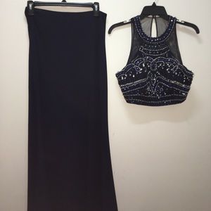 Beautiful navy, 2 piece prom dress!!! Only worn once to one prom! Slight alterations to length of skirt. It had a super cute slit on the left side! Definitely willing to negotiate price!