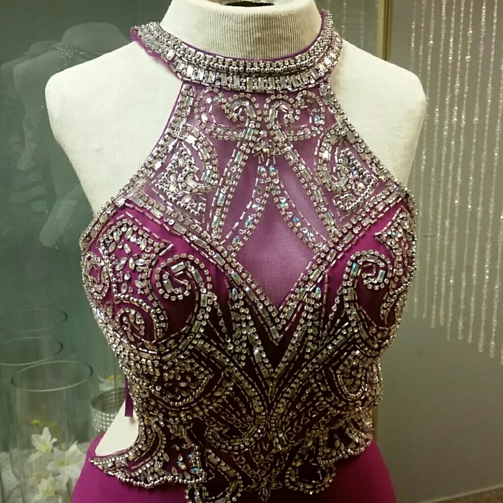 Mangenta , cequence , sparkly multi color. Long, stretch material, the sides of dress is opened, the dress has a tail.