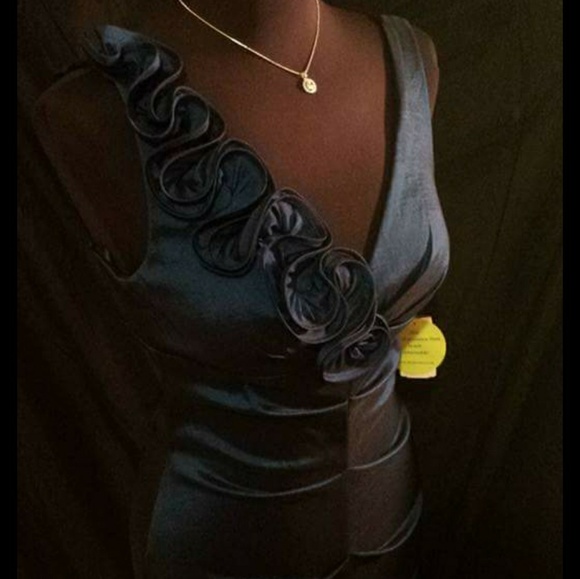 Beautiful navy/dark blue formal. Mermaid style. Form fitting with zipper back. Flower detail on the shoulder. Stretchy