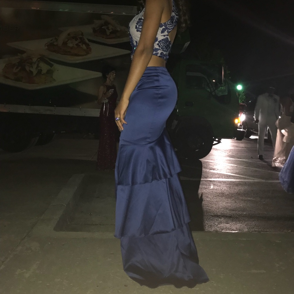 Two piece prom dress with back out blue long skirt with ruffles flowered top with tan under color