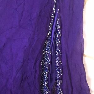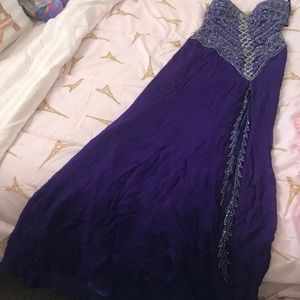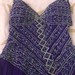Royal purple pageant/formal gown. This dress is Gorgeous!! Top is beaded with purple iridescent and silver beads. Spaghetti strap. Slit down the leg. train adorns the back. originally a size 8, has been altered to a 0 or 2. Will fit both. The back is missing a hook and eye clasp but that is an easy fix. 1 spot has a few beads loose but is not very noticeable. Bottom is wrinkled due to being in a garmet bag, but just needs to be steamed. I am 5’2” but it is a little long and can fit up to 5’5”.