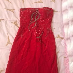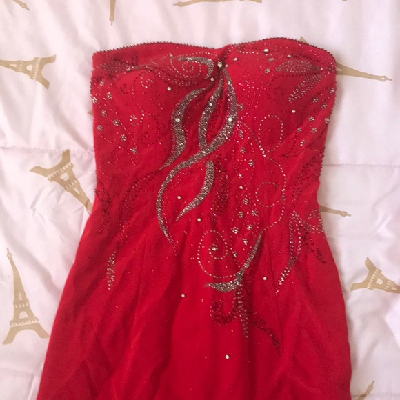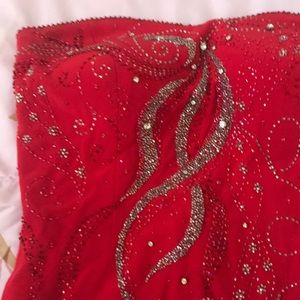 Pageant or formal gown. Would be beautiful for a Christmas party! Gorgeous red color with beading and rhinestones on the top. Dress is simple and elegant. Strapless. Can fit a person who is 5’ to 5’4” is wrinkley but just needs a quick steam! Can also fit sizes 0-2
