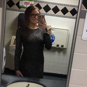 It is a black dress with sparkles covered all over it!! only worn once, absolutely no stains or ruins. The material is stretchy and it is a tight fitting dress