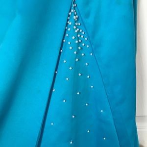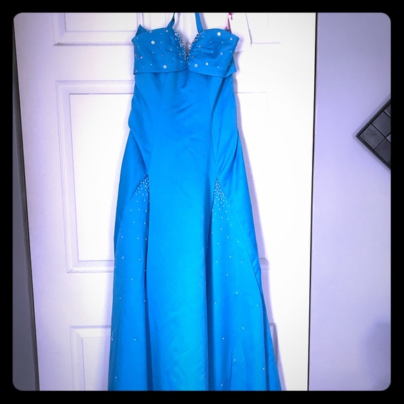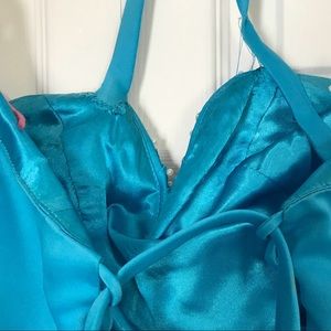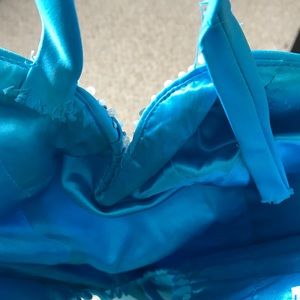 Some minor damage. Sweetheart neckline. I took some of the corset fabric to make into a halter. Could be removed and back to strapless! Some beading is loose (pictured).