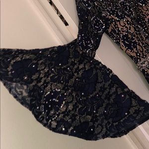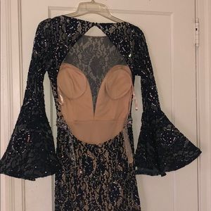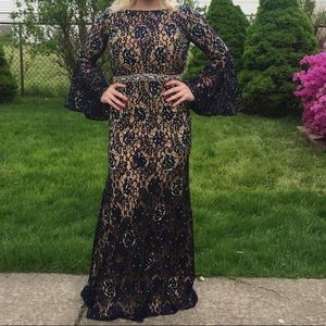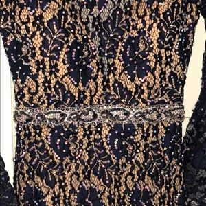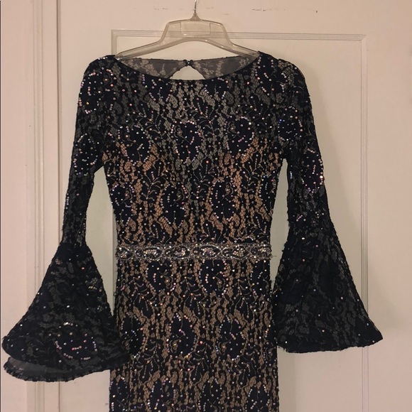 Navy blue with lace overlay and detailed iridescent beading all over with a long train and huge beautiful bell sleeves and a high neck with mid back exposure. Very heavy and expensive material. #PoshLove