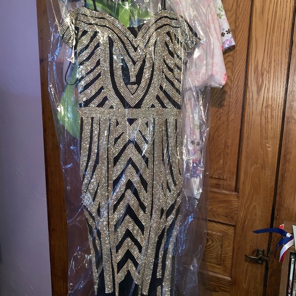 Black and gold diamonds prom dress worn once in great condition. Size 6 and willing to negotiate with the price. Want to sell ASAP ! Beautiful dress