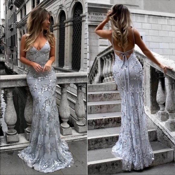 Bought off other posher that was listed as new but there are no tags. Beautiful colors, backless and slight train. Plunging neckline with silver accents
